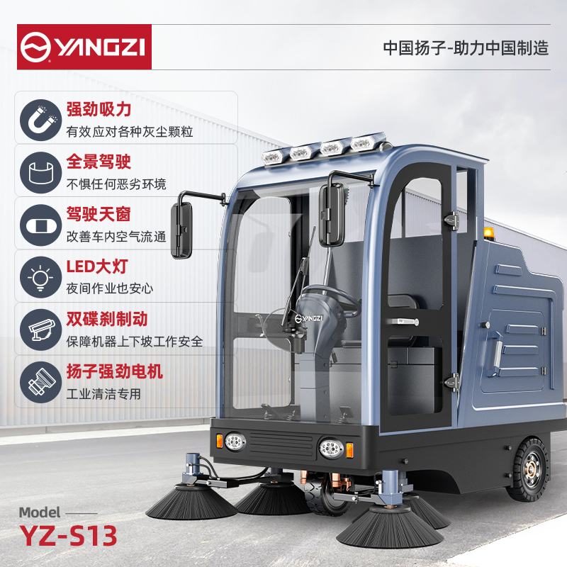揚子YZ-S13駕駛式掃地機使用防撞玻璃,提升安全性能,冷鋼垃圾箱設計傾倒更加方便,實現電動振塵,配備液壓減震裝置,操作更加舒適;設備采用智能控制系統,配備智能液壓升降和