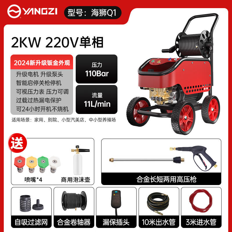 揚子海獅洗車機商用洗車高壓洗車機洗車店養殖場220V大功率高壓清洗機,商用曲軸泵,專用精鍛泵頭,不銹鋼噴瓷柱塞,9股鋼絲編織高壓管,可承受200KG壓力。